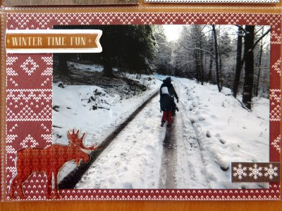 Levá vánoční stránka (tu jsem ukazovala posledně) potřebovala pochopitelně svoji pravou stránku do páru. Použila jsem stejný materiál - Cabin Fever od Carta Bella - i stejný styl. Víc jsem se vyřádila s enamelovými ozdobami - vidíte toho losa? :)